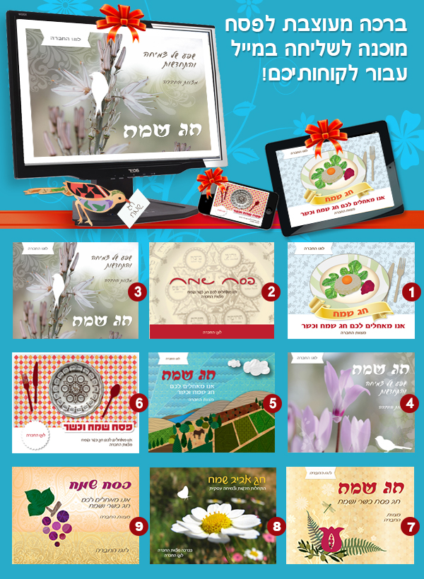 עיצבנו עבורכם 9 ברכות במגוון סגנונות מוכנות לשליחה במייל לכבוד פסח הקרב ובא. בברכות אילו ניתן להוסיף, ברכה אישית מקורית ואת לוגו העסק. עיצוב הברכות והצילומים הם פרי יצירתם של צוות Webmeup